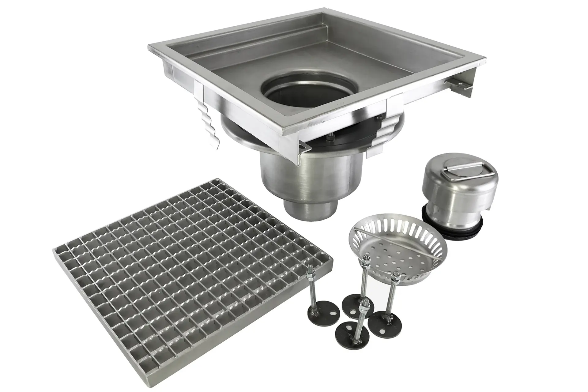 Varje kar är utrustat med en rostfri golvbrunn – en- eller tvådelad – med möjlighet att välja sidoutlopp eller vertikalt utlopp, som ansluts direkt till det interna avloppssystemet. Den integrerade sedimentbehållaren fångar effektivt upp föroreningar, och vattenlåset förhindrar att obehagliga lukter sprids.